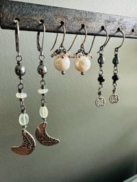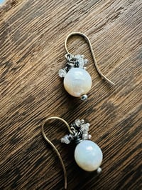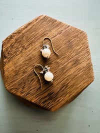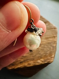 The pearls are wrapped onto sterling silver pins and are crowned with tiny faceted zircons, wrapped in sterling silver.