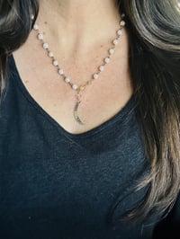 Measures 19.5 inches long, with a drop of 1.75 inches with the herkimer and moon pendant.