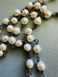 I chose AA baroque freshwater pearls for this beautiful one of a kind necklace. Gorgeous quality and nacre, these 7-7.3mm tall pearls are everyday sized and timeless. Baroque pearls are not perfectly round and are my hands down favorite- each is a one of a kind treasure. This strand has been in my personal collection for years, saved for something special. They have an almost pink sheen at moments. Just glorious!!