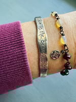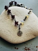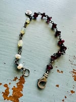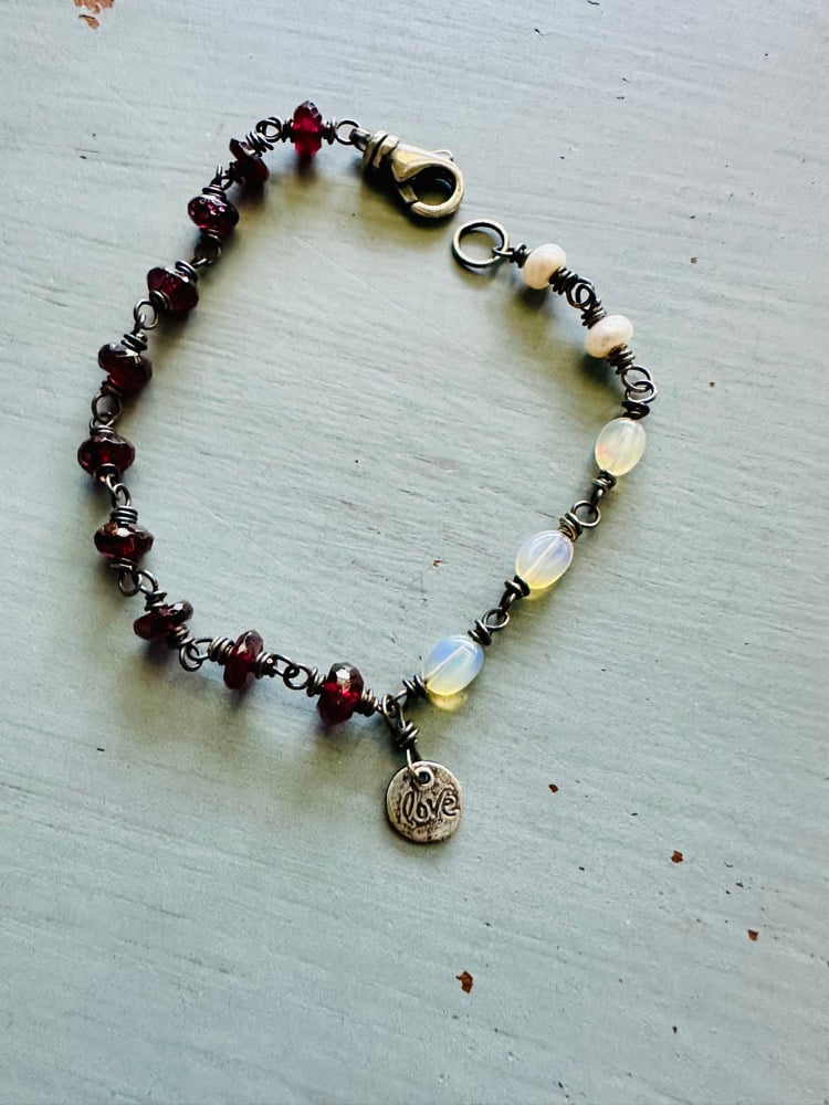Ethiopian opal, pearl, and garnet charm bracelet