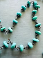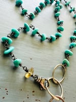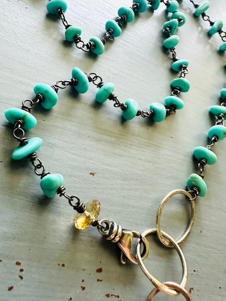 The chain is composed of flawless Campitos turquoise nuggets, each hand wrapped with blackened sterling silver wire. (read: no need to polish, instant heirloom appearance).