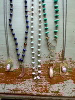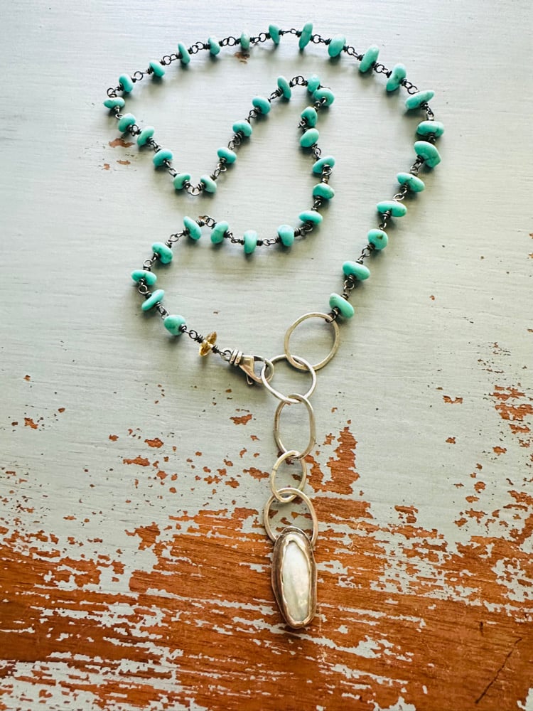 A one of a kind turquoise and pearl necklace, made by hand in my Tennessee studio.