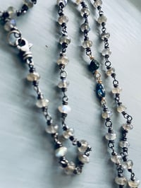 The chain is composed of beautiful and flashy natural labradorite gemstones that I individually hand wrapped with blackened sterling silver wire. (read: no need to polish, instant heirloom appearance)