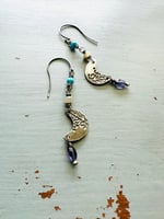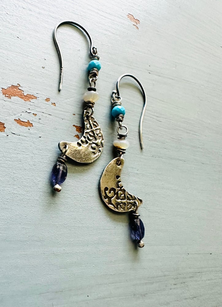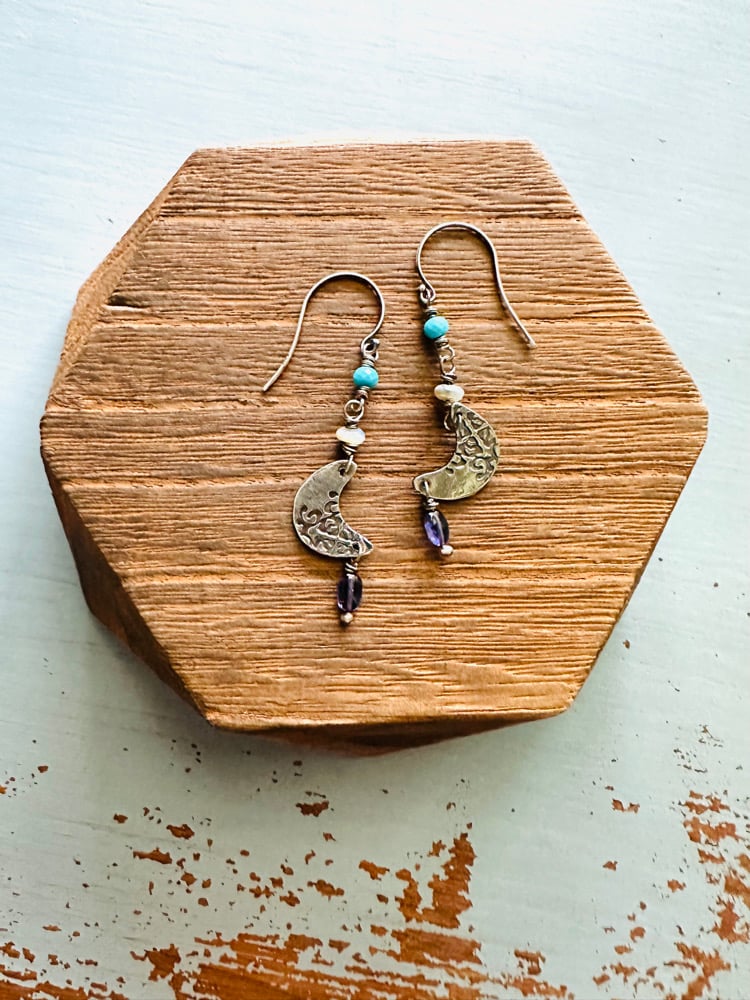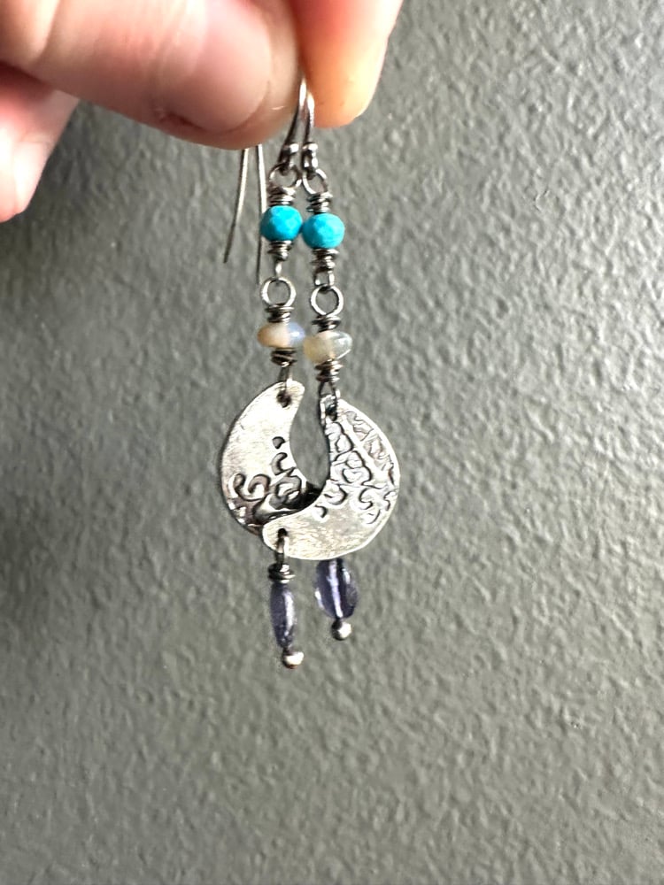 sterling silver crescent moon earrings with opals and turquoise