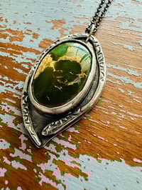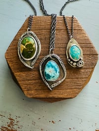 The star of this necklace is a hand cut cabochon of natural Stone Mountain turquoise. It's beautiful and of the highest quality and full of character- just mesmerizing!
