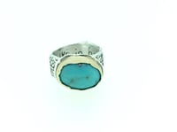 The bezel setting was created by hand for this stone. The base is sterling silver. I chose 14k yellow gold to surround the stone- such a warm and beautiful contrast with the turquoise. I hand carved the bezel edges to flow like water.
